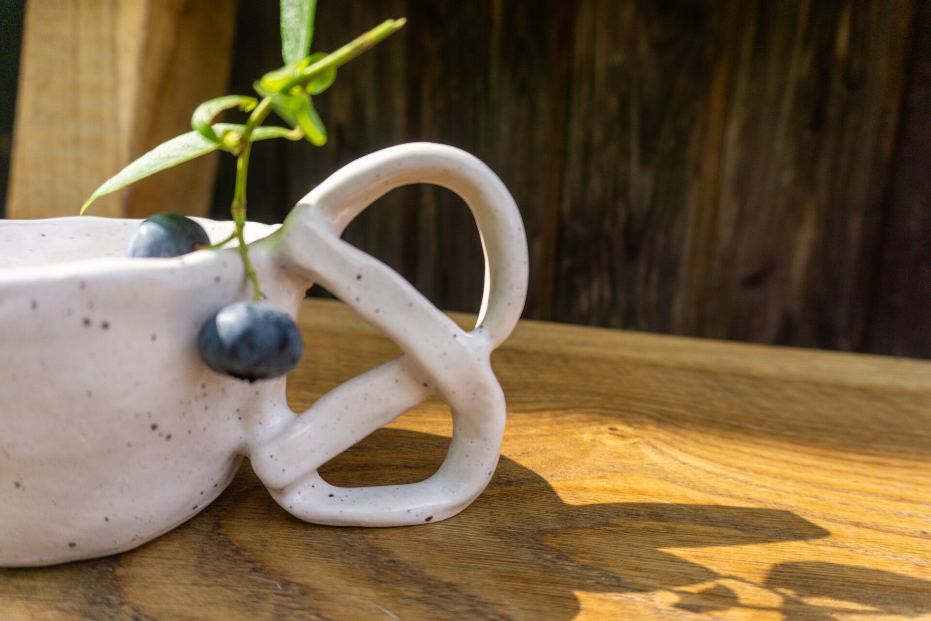 Handgemachte Keramiktasse mit einem brezenförmigen Henkel. Geeignet für einen Espresso, Cappuccino oder einem Getränk deiner Wahlâđ¤